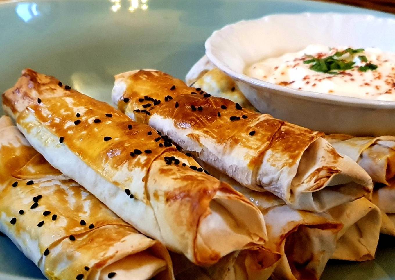 - Kalau semua sudah tergulung, oleskan kuning telur, tabur jintan hitam dan panggang di oven dengan api atas bawah suhu 220° selama 20menit...Sajikan. Saya makan dengan saus yoghurt mix dg cabe bubuk, bawang putih, garam,merica, air perasan jeruk