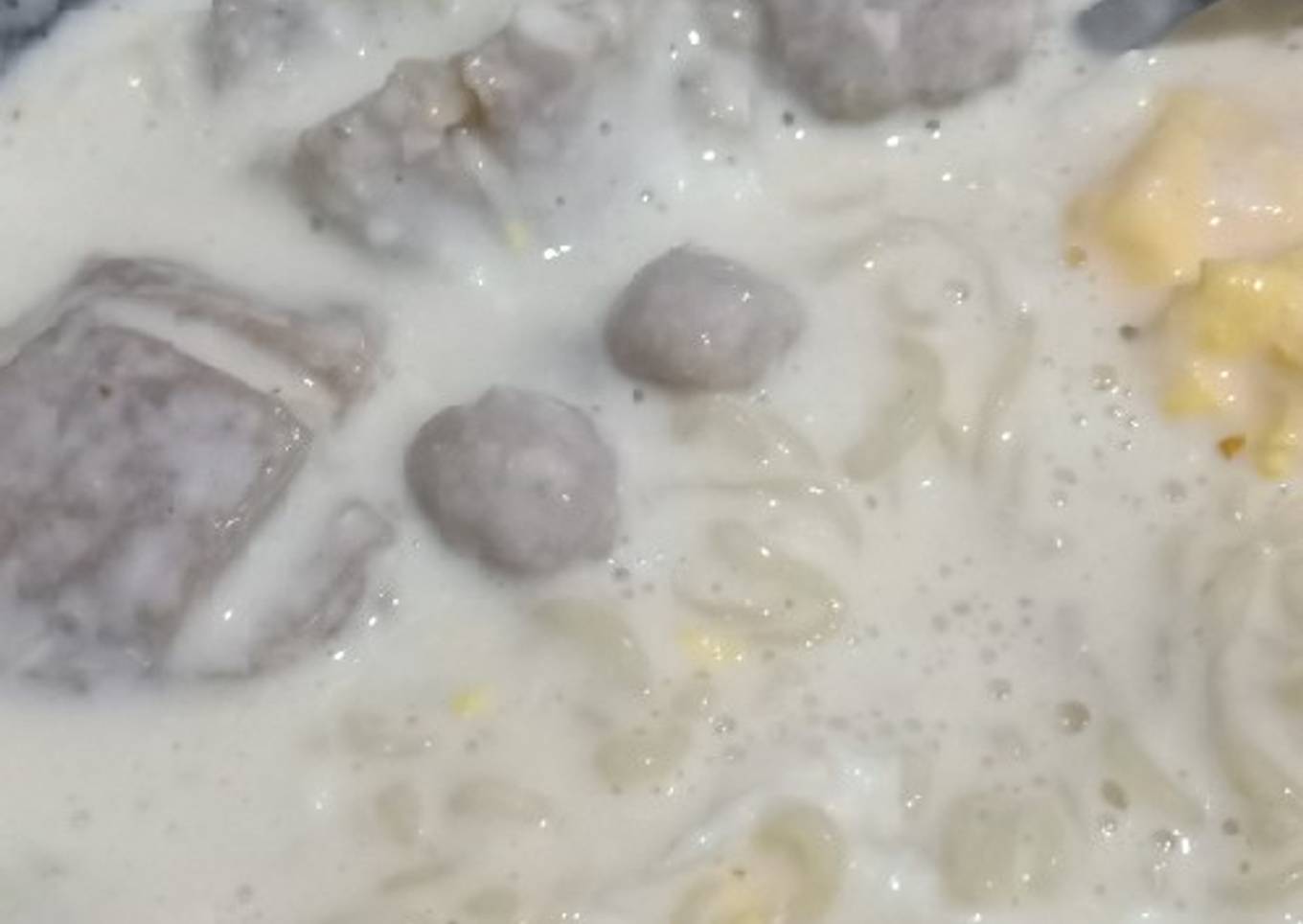- Karena di rumah cuma ada baso sama cilok,jadi aku topingnya pake itu aja,kalo basonya besar di belah dulu ya...biar nanti saat direbus bisa mekar.