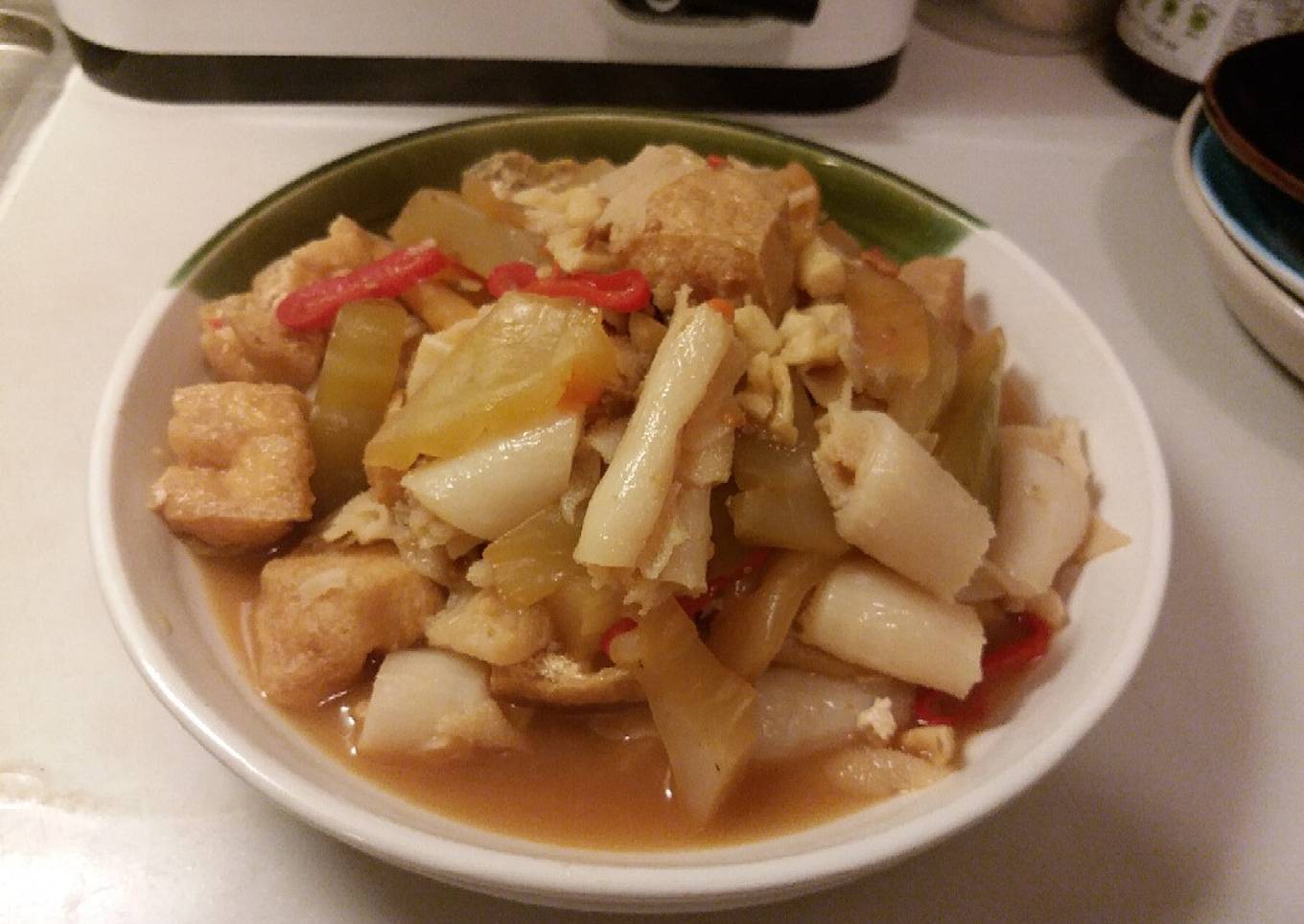 - Rendam ham suin joi/sayur asin biar tidak terlalu asin gonta ganti airnya dan peras.