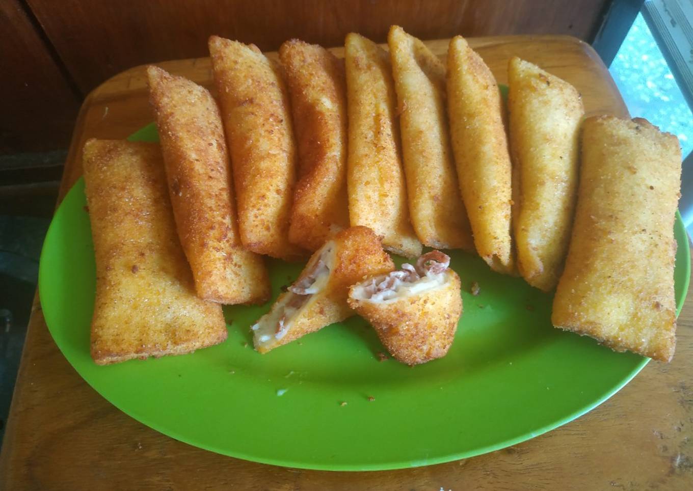 - Tipiskan roti tawar dengan rolling pin(atau pakai gelas kalo gk ada rolling pin), lalu susun isian (keju quickmelt,ham,telur,mayonese) diatas roti lalu gulung roti seperti risol, untuk merekatkan gunakan telur mentah yg sudah diaduk. selanjutkan celupkan gulungan roti ke telur yg sudah di kocok, lalu gulung ke tepung roti, lakukan berulang hingga semua terlapisi.