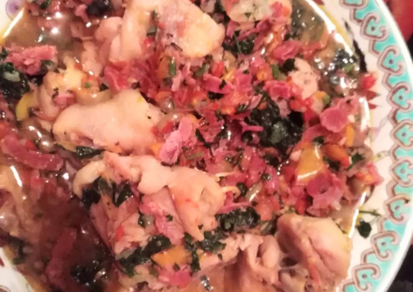 stew Ayam ala Basque direbus dalam saus yang terbuat dari cabai bakar, ham, tomat, bawang putih, dan zaitun. hindangan ini membuat makan malam terasa hangat di malam yang dingin di musim salju.